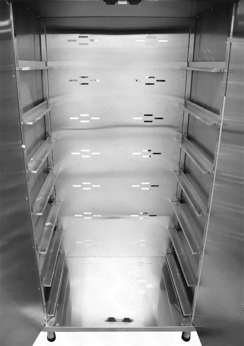 Габариты: 820х560х1800 мм. Материал корпуса - нержавеющая сталь. Вместимость лотков - 7 (456х740х71 мм). Проём открытой дверцы 760 мм. Допустимая нагрузка на полку 15 кг. Допустимая нагрузка 105 кг. Вес (без упаковки) 70 кг.
