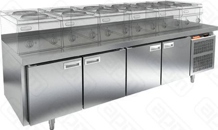 Конструкция стола включает в себя стальную столешницу, четырехсекционную холодильную камеру.