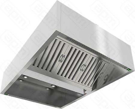 — Зонт вытяжной островной коробчатый — Материал: нержавеющая сталь AISI 430 — С жировыми фильтрами типа "лабиринт"